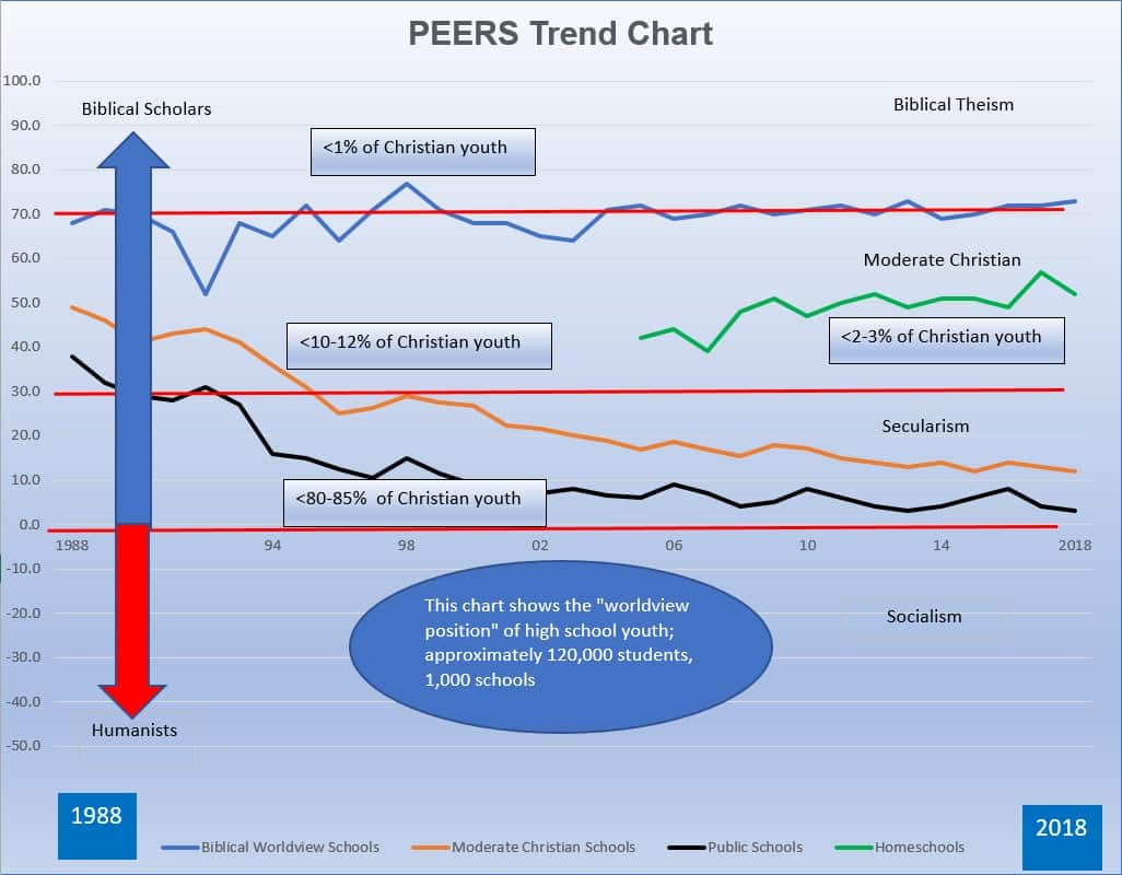 Daniel Smithwick del Nehemiah Institute ha ideato una serie di parametri molto utili per determinare in che misura agli studenti viene insegnata una visione biblica del mondo. Ci ha gentilmente concesso il permesso di riprodurre la sua ultima versione del PEERS Trend Chart (Figura 1), che attualmente copre i trent’anni tra il 1988 e il 2018. Il calo chiaramente attestato nell’acquisizione della visione biblica del mondo da parte degli studenti nelle scuole moderatamente cristiane segue il crollo degli studenti cristiani iscritti alle scuole pubbliche. Gli studenti che seguono l’istruzione parentale (che sono presenti nel grafico solo dal 2005 circa) hanno lentamente guadagnato terreno con un miglioramento del punteggio nella visione biblica del mondo.